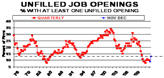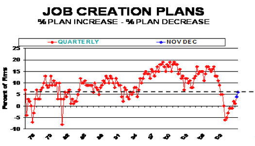 “The good news is that the two job creation indicators, job openings and job creation plans both reached new recovery highs. The percent of owners reporting hard-to-fill job openings rose 4 points to 13 percent, the best reading in 24 months. This indicates that the unemployment rate should improve in December and the months ahead. Plans to create jobs gained 2 points, rising to a net 6% of all owners, the best reading in 27 months. These indicators point to a pickup in job creation activity in the first quarter of 2011. But the small business sector continues to underperform on job creation in this recovery compared to other recovery periods (charts below).”