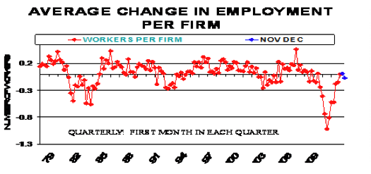 “Reports of net job creation continued to oscillate around the “0” line in December. Asked about changes in total employment over the last three months, 13% of owners reported increasing employment at their firms by an average of 3.5 workers while 14% reported reducing total employment an average of 2.9 workers per firm. Clearly, no surge in hiring in December. This produced a reduction of -0.07 workers per firm, basically unchanged from the “0” October reading and +0.01 reading in November. In normal times, this measure would be in the range of 0.1 to 0.2 workers per firm (chart below). Still, the percent reporting higher employment levels is the second highest reading since December, 2007 (the peak of the last expansion according to the National Bureau of Economic Research) and the percent of owners reporting lower employment was down 2 points from November.