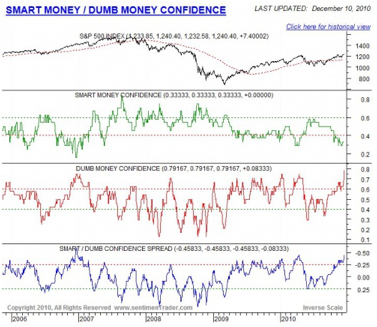 “Examples of some Dumb Money indicators include the equity-only put/call ratio, the flow into and out of the Rydex series of index mutual funds, and small speculators in equity index futures contracts.