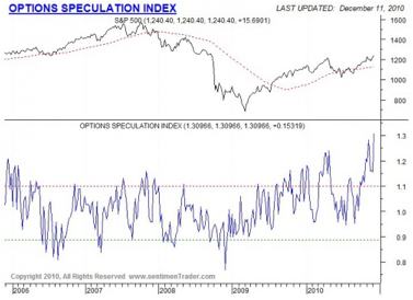 “While it is rather self-explanatory, here is the official interpretation of the chart: The Options Speculation Index takes data from all the U.S. options exchanges and looks at opening transactions. We total the number of transactions with a bullish bias (call buying and put selling) and also the number of those with a bearish bias (put buying and call selling). The Index is a ratio of the total bullish transactions to the total bearish transactions. The red and green bands on the chart are 2 standard deviations from the one-year average of the index.