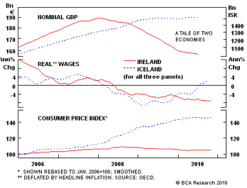 “In Ireland, the boom in real estate prices triggered a massive borrowing binge, driving total private non-financial sector debt to almost 200% of GDP, among the highest in the euro area economy. In stark contrast to the Icelandic situation, however, the Irish economy has become stuck in a debt-deflation spiral. The government has lost all other options but to accept the €85 billion bailout package from the EU and the IMF. The big problem for Ireland is that fiscal austerity without a large currency devaluation is like committing economic suicide – without a cheapened currency to re-create nominal growth, fiscal austerity can only serve to crush aggregate demand and precipitate an economic downward spiral. The sad reality is that unlike Iceland, Ireland does not have the option of devaluing its own currency, implying that further harsh economic adjustment is likely.”