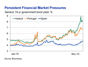 “What is remarkable is that since the Greek bailout was unveiled back in May, instead of alleviating fiscal concerns in the Eurozone periphery, contagion risks have actually intensified. Even with German 10-year bond yields declining 25bps, they have risen nearly 70bps in Italy, 150bps in Spain, 225bps in Portugal, 420bps in Greece and 460bps in Ireland. Once the stabilization fund ends in 2013, there is no way these countries can fund themselves at current debt-service cost levels.