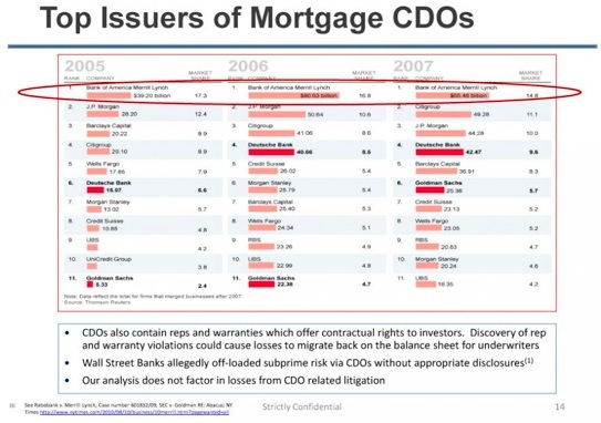 Further to the case on BAC, Merrill was the largest originator of subprime CDOs during the housing boom, for another $120 billion, along with about $255 billion of residential mortgage-backed securities.