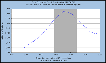 “What do you know? Outstanding U.S. consumer credit expanded $3.3 billion in October after eking out a $1.3 billion increase in September. This is the first back-to-back gain since just before Hank Paulson took out his bazooka in the summer of 2008.